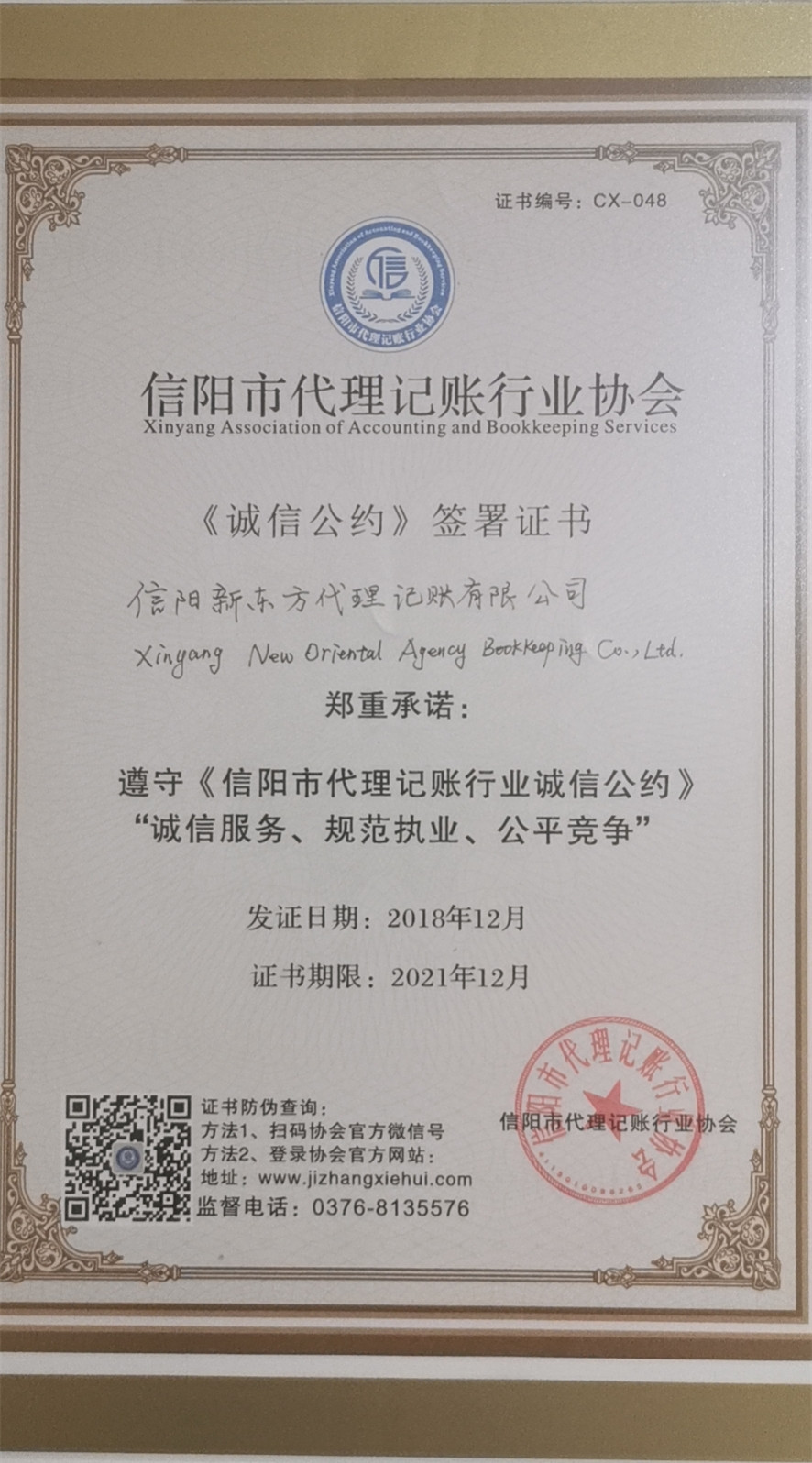 信阳新东方代理记账有限公司服务范围:工商注册、纳税申报、财税咨询、税务代理、清理乱账、公司注销、公司变更、公司增资、工商年检、一般纳税人认定、商标注册、资质申办、医疗器械许可证、食品经营许可证、房地产经纪人证代办